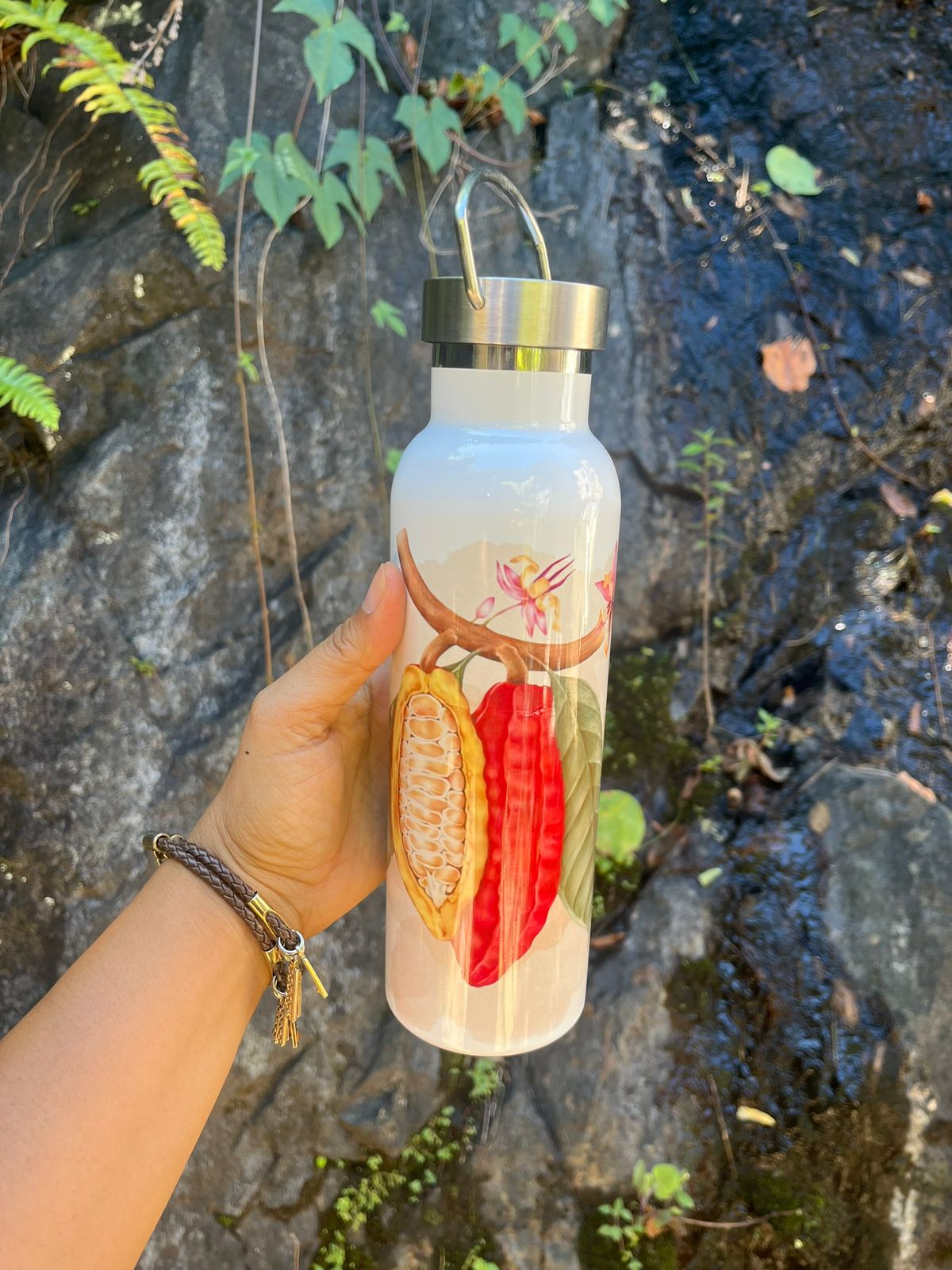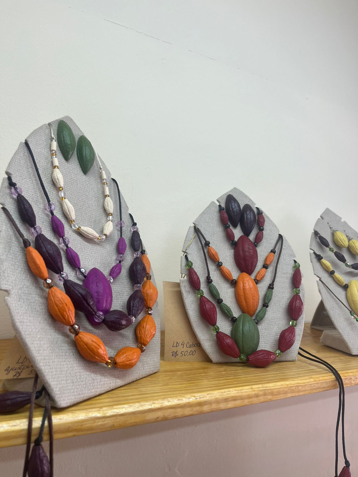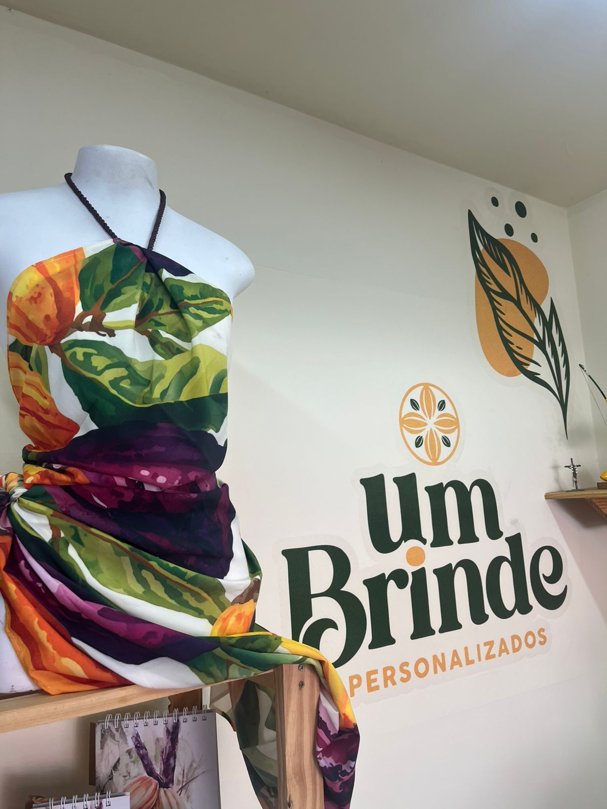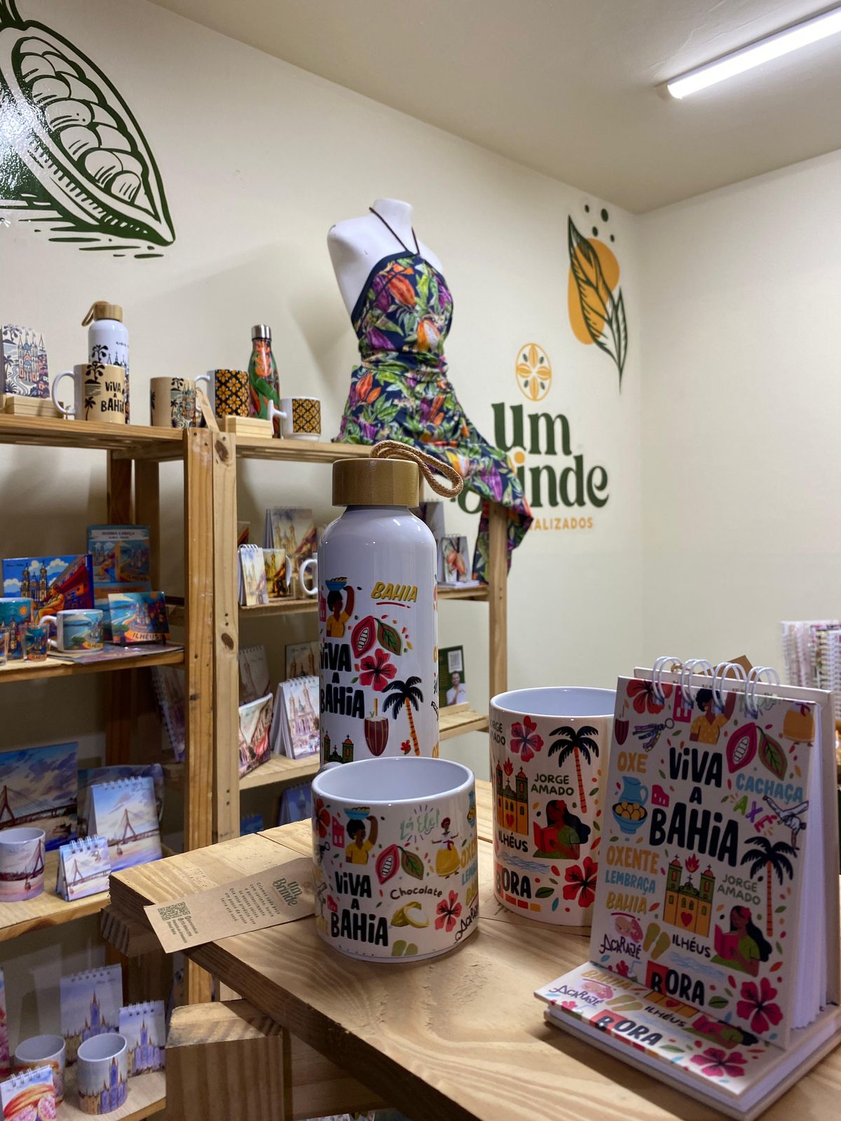 Vestidos e camisas com estampas de cacau, colares e brincos de cacau, cadernos, garrafas de água, canecas exclusivas com estampas autorais e de artistas plásticos locais. Uma variedade de produtos com uma curadoria focada na identidade local.